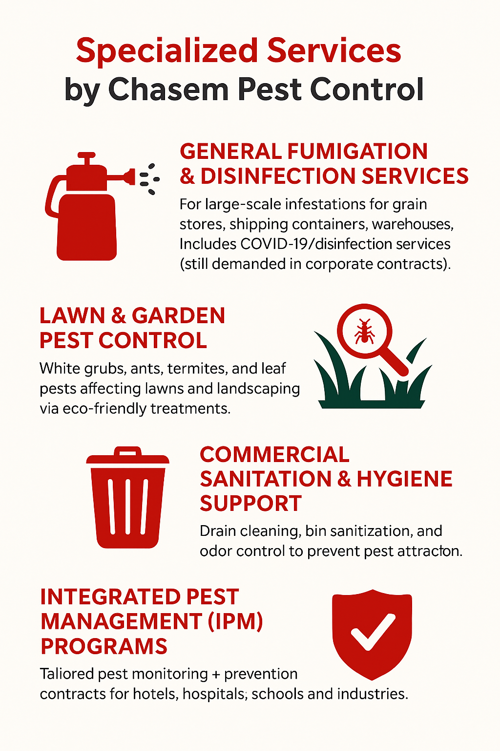 Additionally, Chasem offers disinfection services for bacteria, viruses, and fungi, including specialized COVID-19 sanitization. This service remains essential for corporates, schools, hospitals, and hotels that require high hygiene standards.
